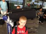 After arriving in San Fran, Griffin decides to hide behind our voluminous luggage. Next stop – cargo area to pick up Jake and Scout.