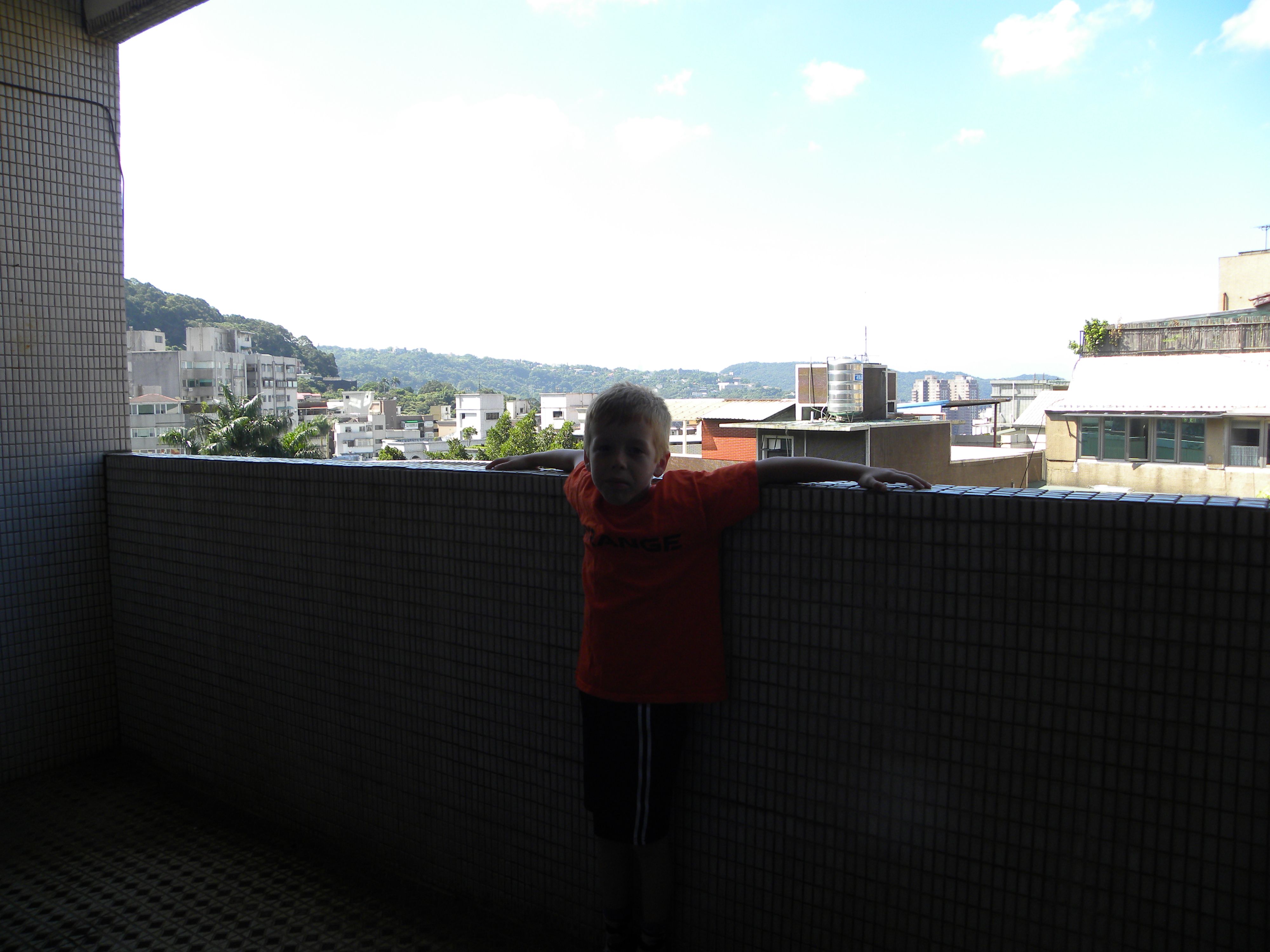 Bodhi shows off our small balcony.
